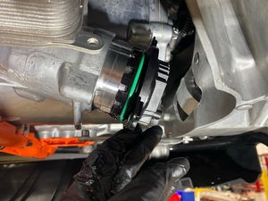 NoteCarefully insert a plastic wedge between the oil pump and the lower housing bracket. In small increments, work the wedge between the lower housing bracket and the oil pump until the green O-ring is visible. Remove the oil pump by hand towards the rear of the vehicle.NoteResidual oil will drain from housing; allow the oil to drain.