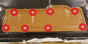 - Remove and discard the bolts (x8) that attach the HV battery rear access cover to the HV battery.