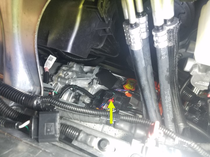 - Connect the frunk harness to the front drive unit harness connector, and then push in the red tab to secure.