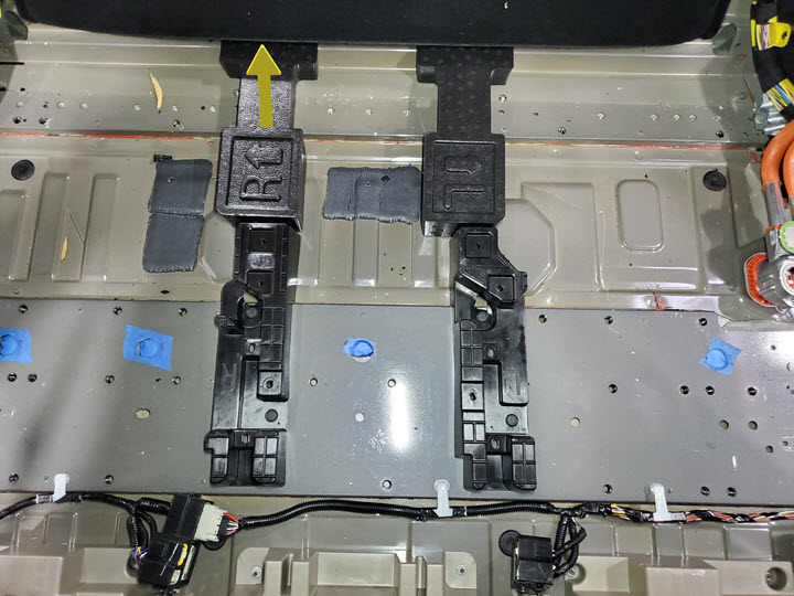 - Position the LH 2nd row seat inboard front floor plate into the vehicle, secure the clip that attaches the floor plate to the vehicle, and then install the front plate decal onto the seat track base to cover the fastener.
