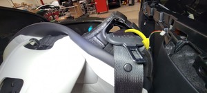 - Release the J-hook clip that attaches the upper half of the LH 3rd row seat upholstery to the seat.