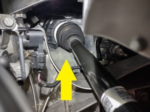Note1x U-bolt, 2x nuts, 10mm, Torque hand-tight, Wrap cable around inner joint, then tighten with U-bolt, Use slide hammer with cable eyelets to release, To avoid damage to the halfshaft boots and oil seals, exercise caution when removing, If oil cooler is present (Performance), place towel on oil cooler to protect during removal and install.