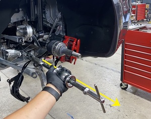 - Install the hub puller onto the LH rear brake rotor, and hand tight.