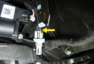 - Release the RH footwell duct air temperature sensor from the HVAC assembly, disconnect the electrical connector, and then remove the sensor from the vehicle.