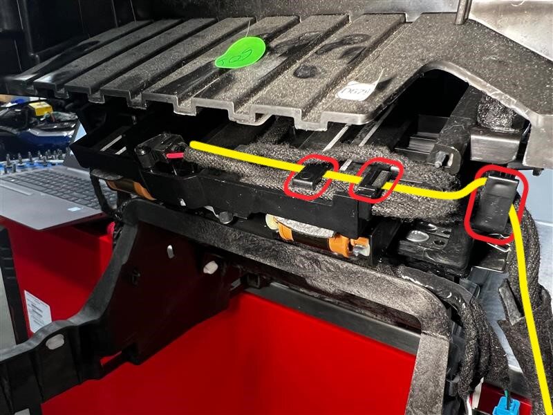- Release the tabs (x3) that attach the center console lid switch harness to the 1st row center console assembly, and then remove the tape that attaches the switch harness to the harness bundle.