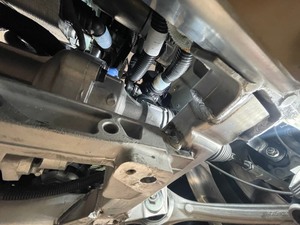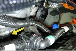 Guide thermal bar battery return hose between supermanifold and front drive unit and AC compressor bracket above PT coolant pump