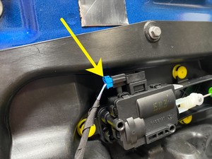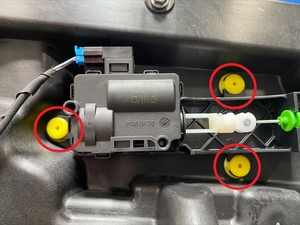 - Install the release cable into the LH front door E-release actuator, position the actuator onto the LH front door closeout panel, and then install the clips (x3) that attach the actuator to the closeout panel.