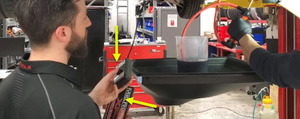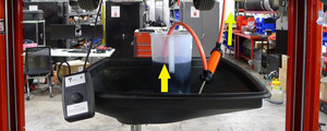 NoteAssistant required, Do not run pump dry, Pump 5 full strokes from fluid container, While simultaneously running oil pump switch box for entire fill process. Keep running oil pump switch box until drain plug is installed in next step, If pump is not running and drain plug is not installed fluid will drain from plug within 10 seconds. Note: The minimum refill capacity of the rear drive unit assembly is 2.1 liters. Using excess gearbox fluid in the fill container allows the oil pump to dispense the full 2.1 L without drawing air. Make sure that there is less than 200mL left when completed