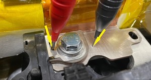 CAUTIONDo not short the side of the probe tip to the edge of the busbar.NoteThe resistance must be less than 0.045 mΩ (45 μΩ). There is too much resistance in the High Voltage joint. Remove the fastener, clean areas with isopropyl alcohol, install fastener back and test again.