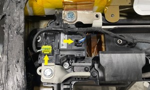 - Disconnect the electrical harness from the HV battery negative contactor connections (x2), and then move the electrical harness aside.
