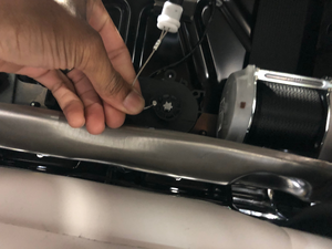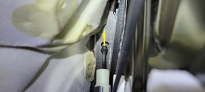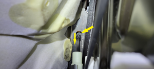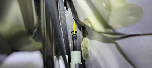 Cut the zip tie that attaches the LH 3rd row seat recliner actuator cable to the seat