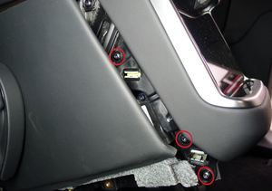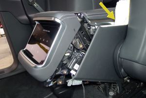- Release the clips (x4) that attach the rear of the LH center console side panel to the center console, and then use a shop towel to separate the side panel from the center console assembly. Repeat this step for the RH center console side panel.
