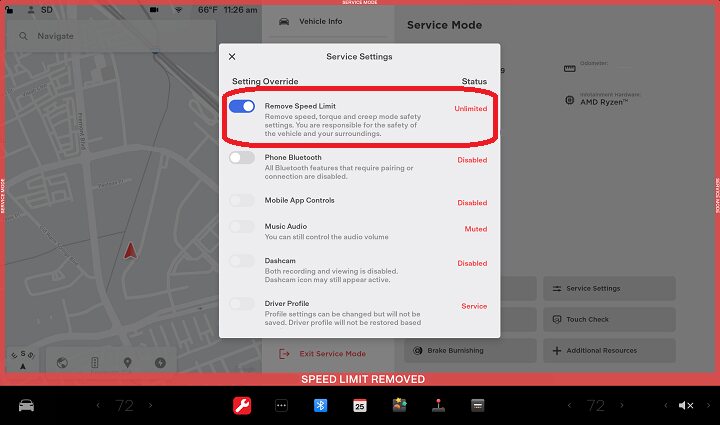 4. Disable the "Speed Limit" on the touchscreen: Touch Service > Service Settings > Remove Speed Limit.
