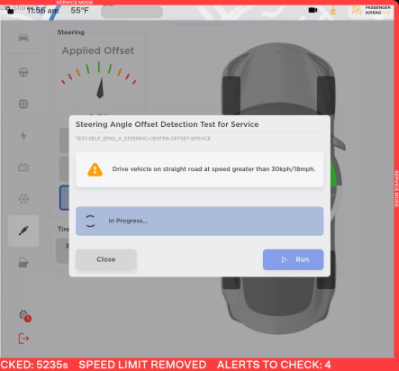 7. Touch Service > Chassis > Alignment and Tires > Offset Drive Test > Run, and then drive the vehicle in a straight line for 500 m, going at least 18 mph (30 km/h).