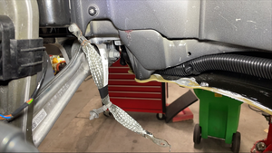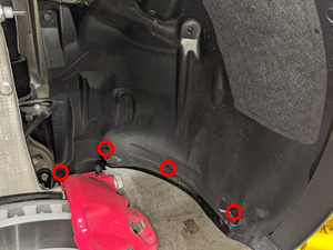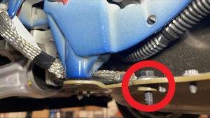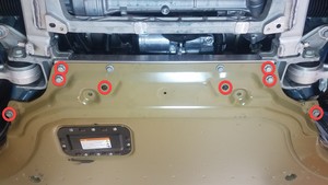 Torque bolts securing front skid plate to front subframe.