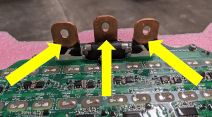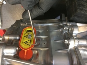 - Remove the bolts (x3) that attach the front drive unit motor 3-phase terminals to the front drive unit inverter 3-phase terminals.