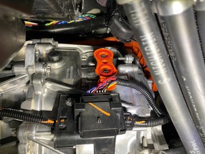 - Connect the HV harness from the A/C compressor HV header, and then slide the black locking tab.