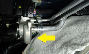 - Slide the powertrain coolant pump away from the A/C compressor, and off of the A/C compressor lower bracket.