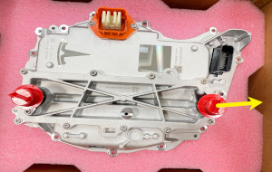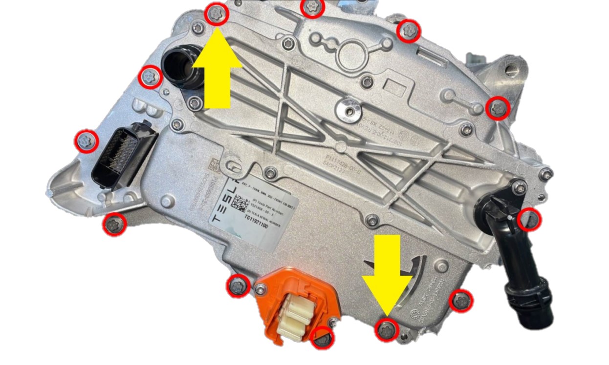 - Remove the bolts (x12) that attach the front drive unit inverter to the front drive unit gearbox..