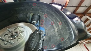 - Release the clips (x7) and fan clip that attach the rear portion of the RH front wheel arch liner to the body, and then carefully rest the rear portion of arch liner on the brake rotor.
