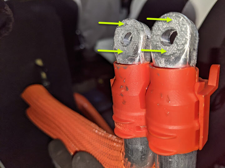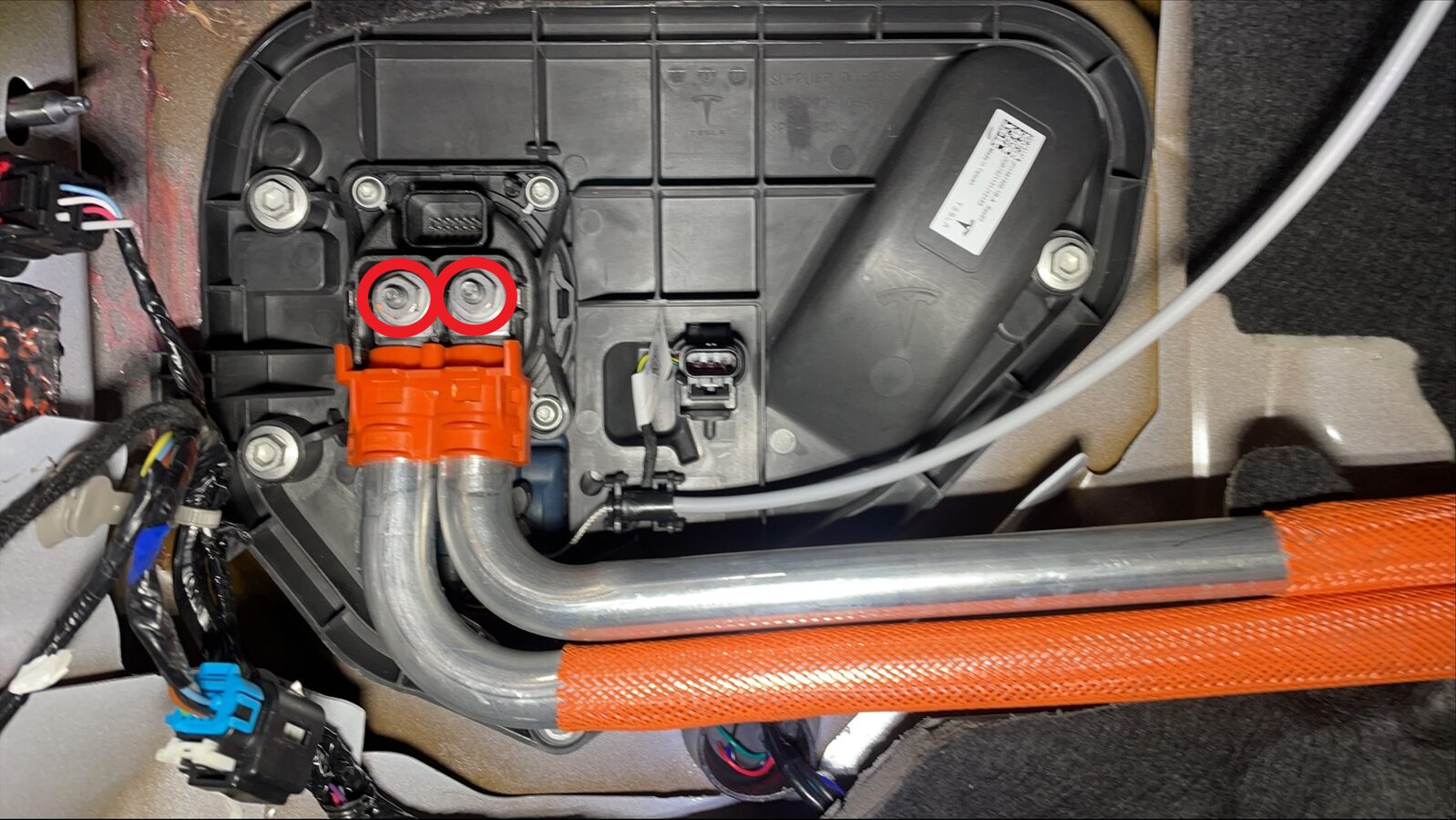 Note2x HV joints, Measure both joints at the highlighted locations, The acceptable resistance is between 0.050 mΩ (50 μΩ) and 0.270 mΩ (270 μΩ).If the resistance is greater than 0.270 mΩ (270 μΩ), there is too much resistance in the High Voltage joint. Remove the fastener, clean areas with isopropyl alcohol, install fastener back and test again. If the resistance is lower than 0.050 mΩ (50 μΩ), reposition the probes and measure again. If the resistance is repeatedly between 0.00 mΩ and 0.050 mΩ (50 μΩ), Hioki test passed, proceed to next step.