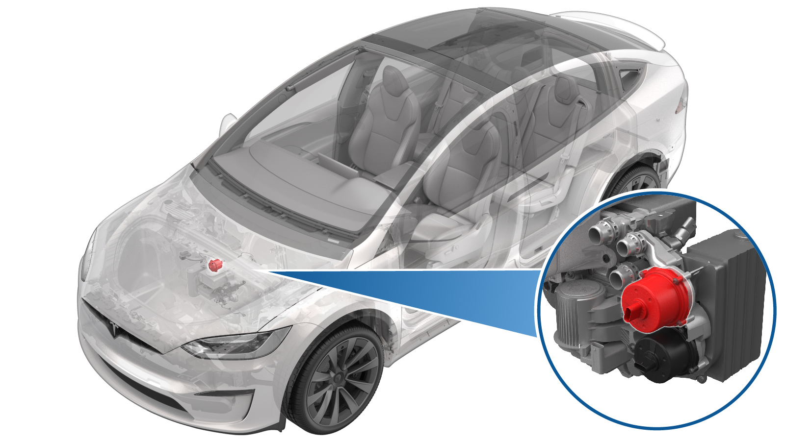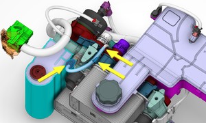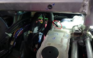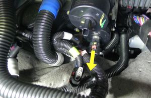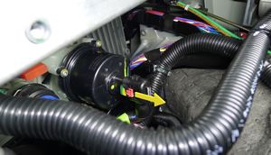 - Route the thermal bar harness between the powertrain coolant pump and the chiller coolant pump, then secure the connectors (x2) that attach the thermal harness to the powertrain coolant pump and the chiller coolant pump.