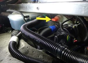 - Disconnect the powertrain supply hose from supermanifold, and plug the ends of fittings as soon as possible to avoid coolant loss.