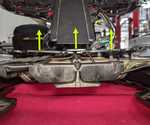 Remove bolts securing 2nd row LH monopost under belly trim