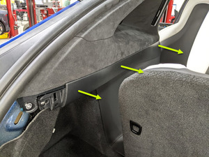 - Install the LH mid C-pillar trim to the LH mid C-pillar zone bracket, and then fasten the clips (x9) that attach the mid C-pillar trim to the C-pillar zone bracket.