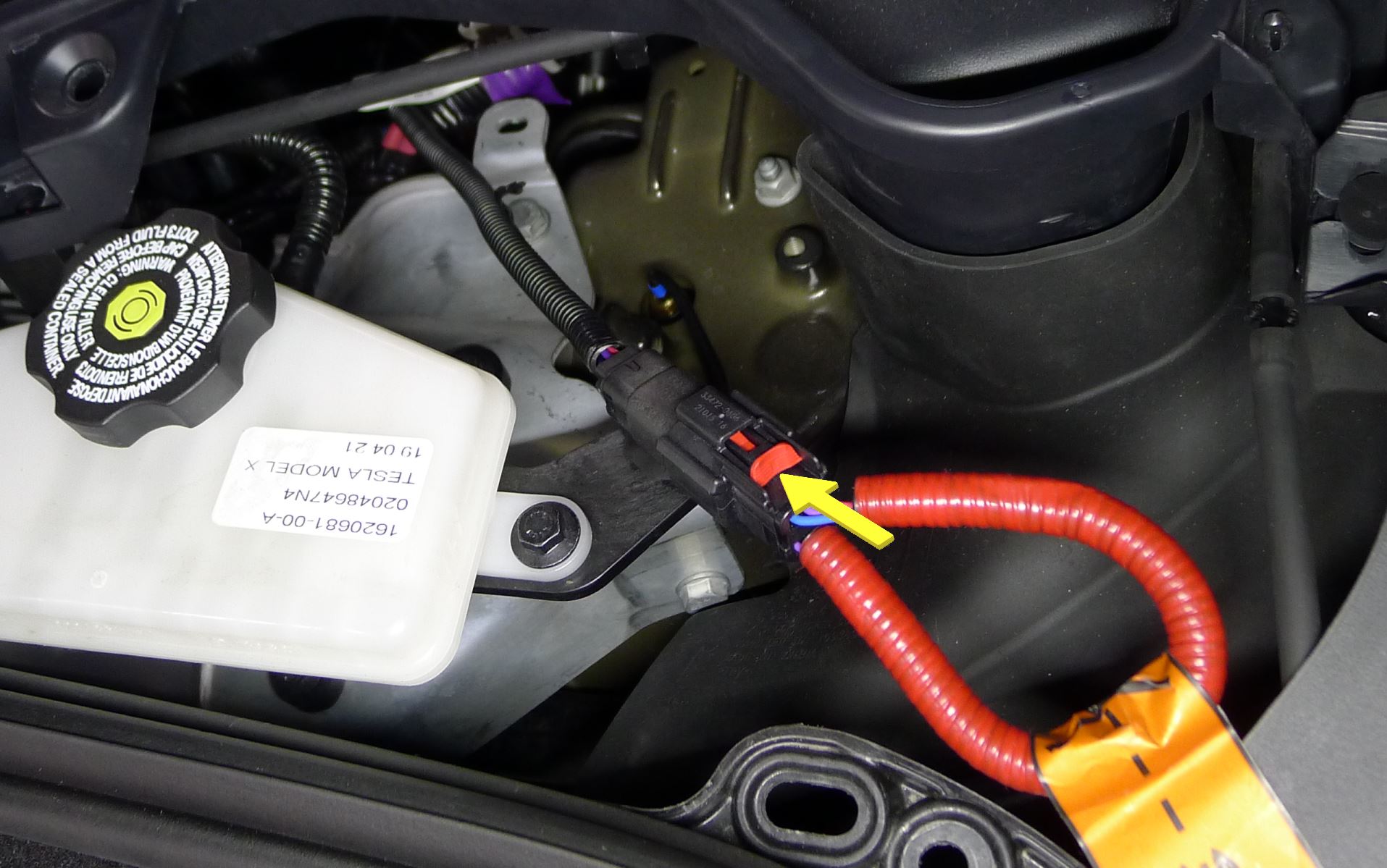 - Lift up on the locking tab, and then pull the black connector lock away from the cables. Pull up on the LV battery electrical connector to disconnect it.