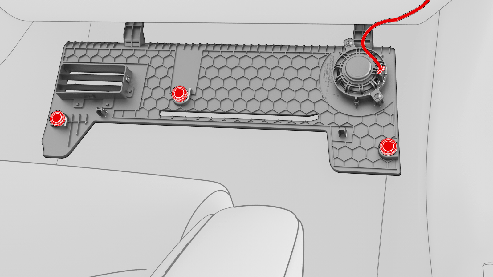 - Position the RH footwell cover on the vehicle, connect the electrical harness to the speaker, and then install the magnets that attach the cover to the vehicle.