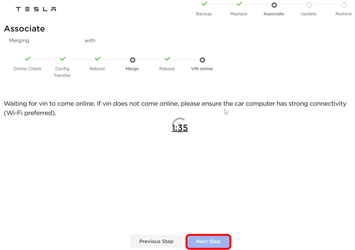 - Follow the prompts to transfer configurations and associate the replacement car computer. The car computer will reboot several times.