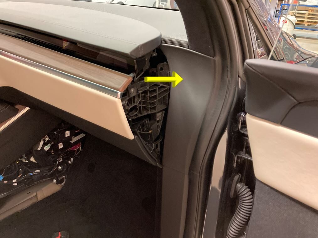 Note2x clips, 3x datums, Release clips from upper A-pillar and IP sub assembly, Lift mid A-pillar trim out of lower A-pillar trim