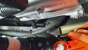 - Install the clip that attaches the battery supply hose to the RH toeboard brace.