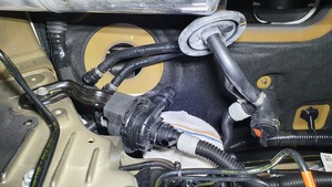 Install the car computer supply hoses back through the firewall towards the car computer cold-plate assembly, and then install the coolant hose clamps on the hoses.