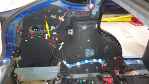 - Fasten the clips (x12) that attach the LH body harness to the lower C-pillar, and then connect the electrical connectors (x3).