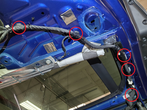 - Install the clips (x4) that attach the LH upper rear door harness to the LH rear door.