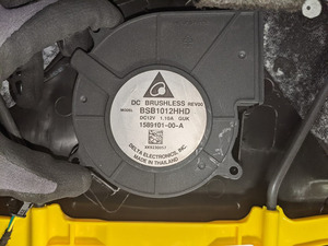- Release the tabs (x4) that attach the fan cover to the seat back, and then remove the driver seat backrest fan from the seat back.