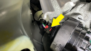- Release the clip, disconnect the supermanifold to battery supply hose from the battery coolant pump.