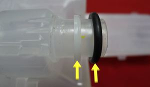 NoteEnsure both spacer and O-ring are present and seated before installation. Lubricate the coolant bottle O-ring.