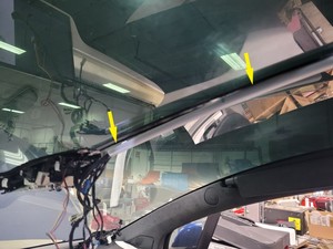 - Position the rear view mirror harness cover into the vehicle, slide the cover rearward into the headliner, and then secure the retaining clips (x16) that attach the cover to the windshield bracket.