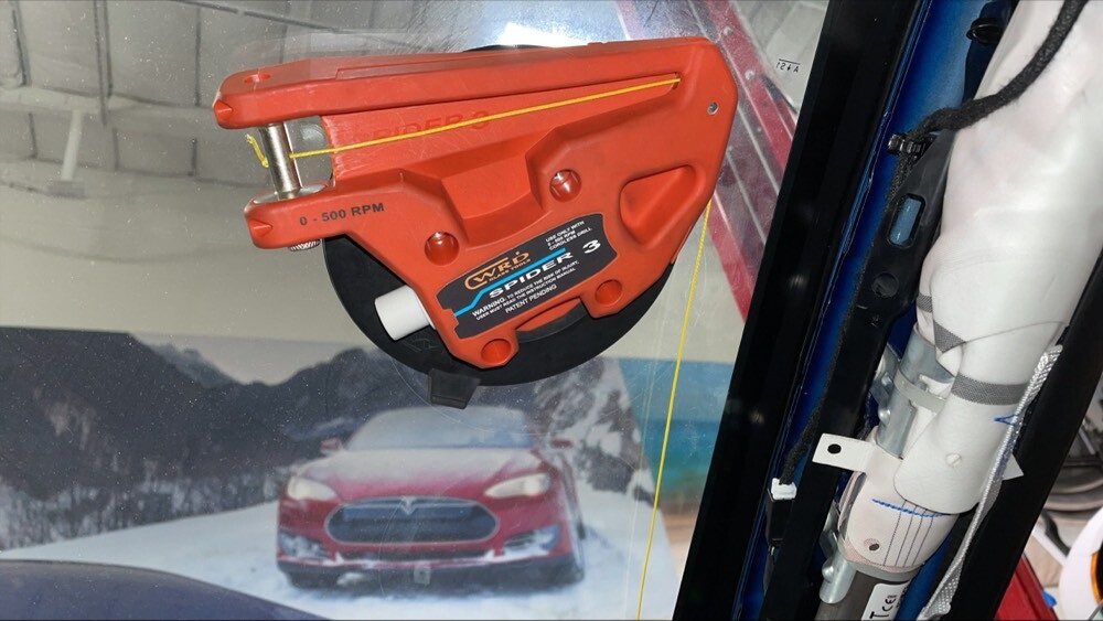 Attach an anchor point to the exterior of the windshield, and then secure the line.