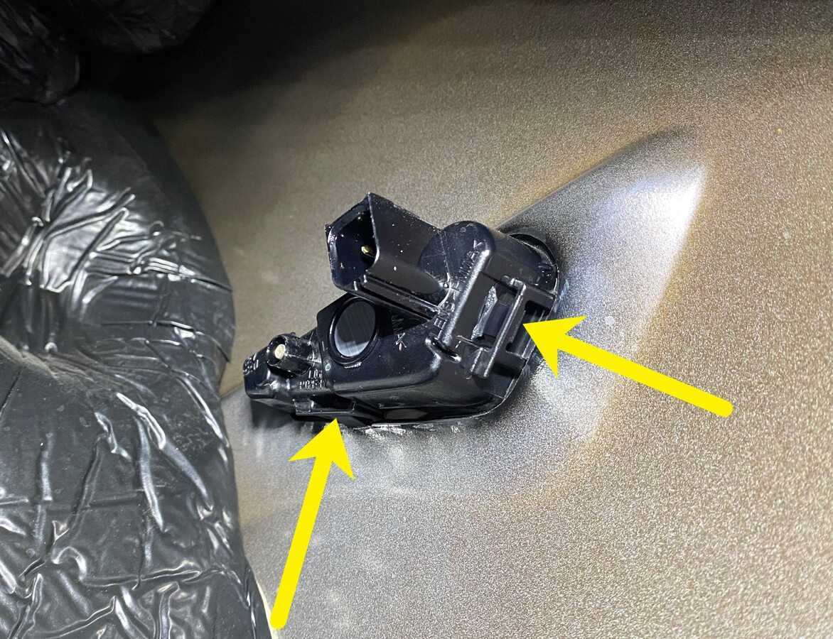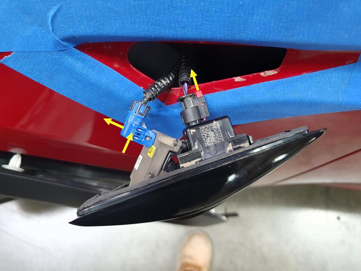 NotePress down on the lock release and pull the connector away from the side repeater camera. Release the red locking tab and press down to disconnect the side repeater connector.