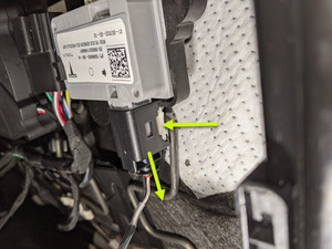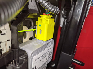 - Slide the locking tab toward the left of the connector, and then release the airbag electrical connector downward to disconnect it from the front passenger seat OCS ECU module.