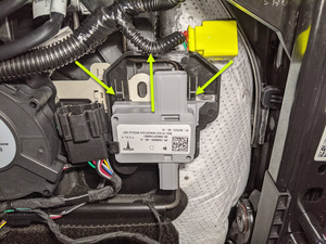 - Press the locking tabs (x2), and then slide the front passenger seat OCS ECU module upward to remove it from the seat bracket.