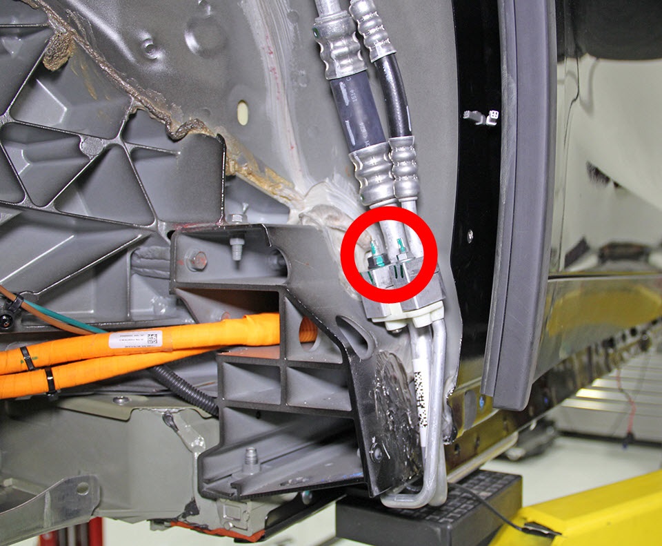 - Remove the nuts (x2) that secure the rocker high/low pressure pipes to the rocker-to-rear-HVAC high/low pressure pipes (torque low pressure side 20 Nm, torque high pressure side 10.5 Nm).