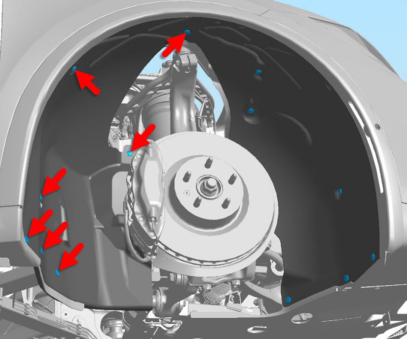 - Release the rear push clips (x7) that secure the front wheel arch liner to the vehicle.