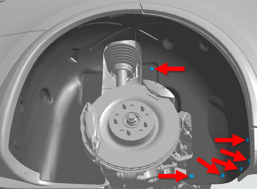 - Remove the rear nut that secures the front wheel arch liner to the stud on the chassis (torque 6 Nm).