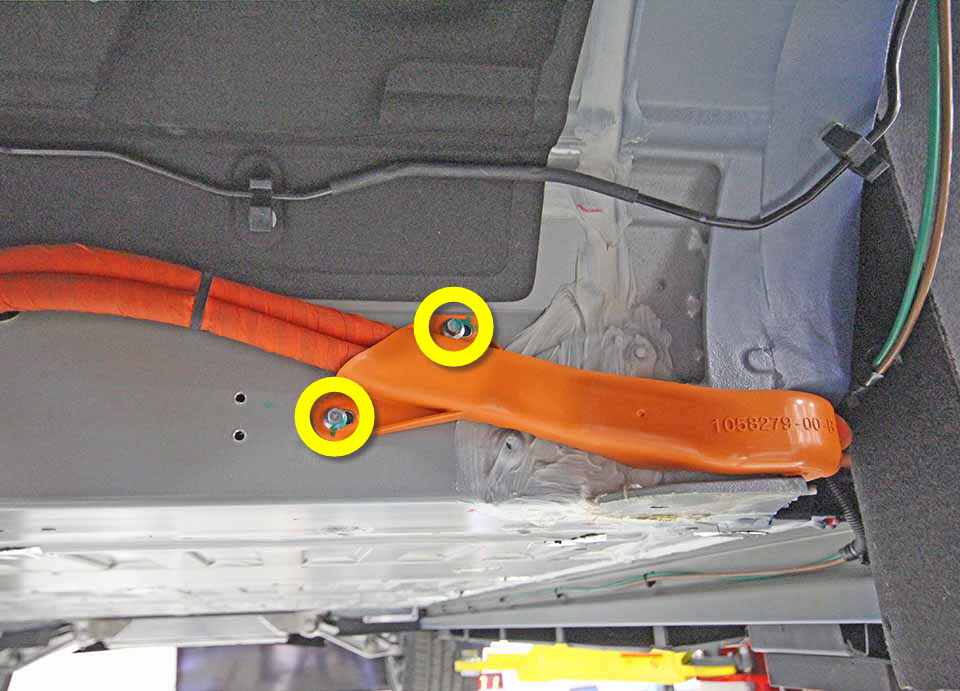 - Install the bolts (x2) that secure the HV cable bracket to the body of the vehicle (torque 7 Nm).