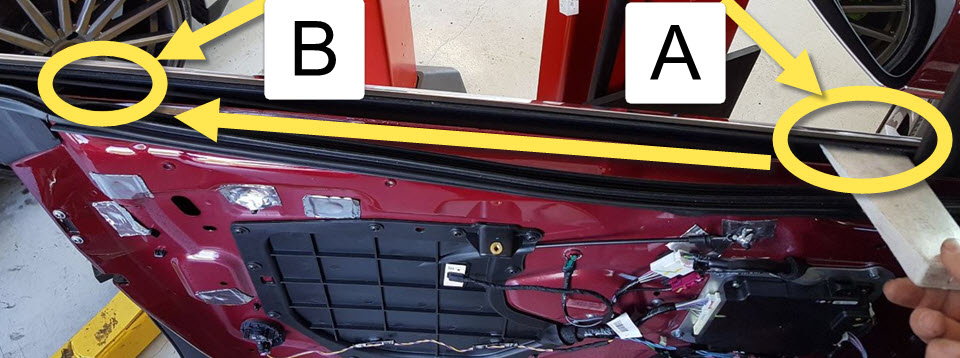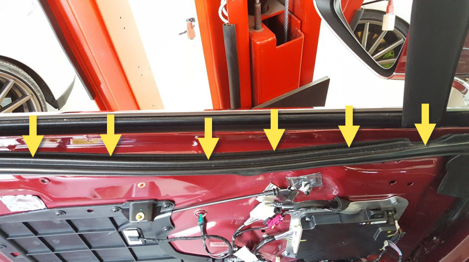 - Gently lift and pull the front door inner belt seal away from the door, but do not completely remove the seal.
